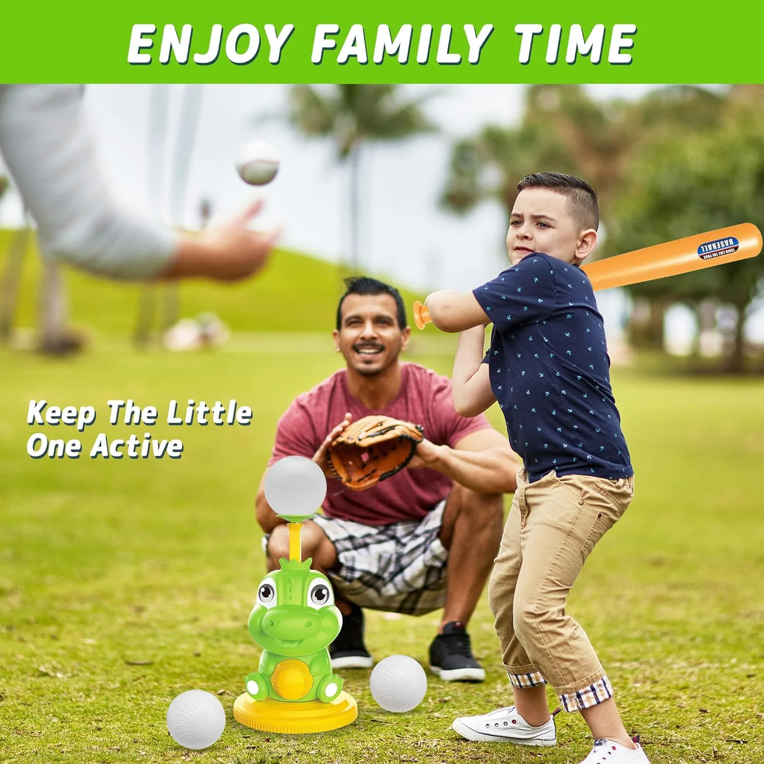 - Toddler Baseball Set includes: 1x pitching dinosaur, 1x bat, 3x baseballs.