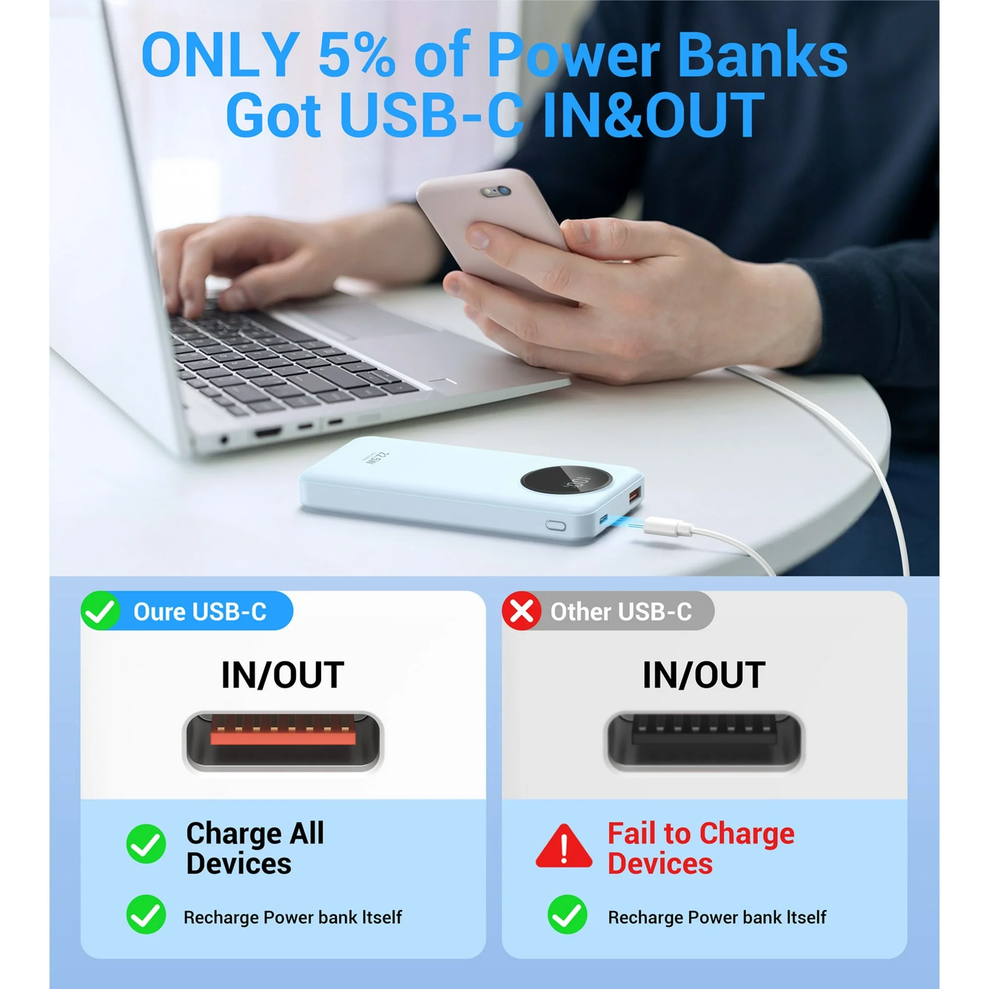 - 【22.5W Fast Output & LED Power Display】The Type-C output cable and USB output port of the portable phone charger use PD 22.5W fast charging technology to quickly charge your device. The LED power display lets you know your power level clearly.