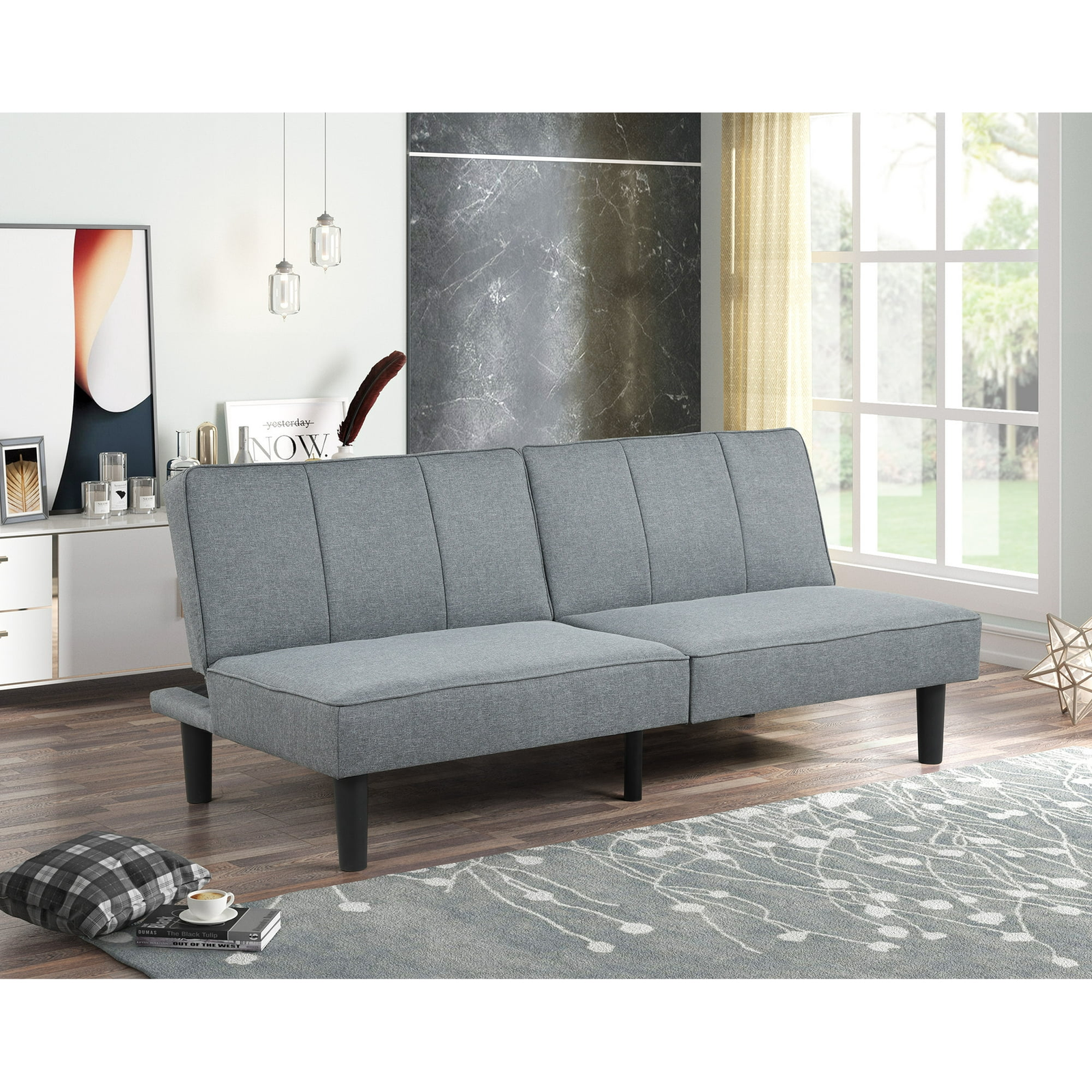 When versatility is the rule, the Mainstays Studio Convertible Sofa Futon in upholstery linen fabric is happy to abide whether at home or office. Made for the high-traffic areas, this product is the ideal combo of modern functionality and style. Its contemporary design can blend into any home or office decor. Constructed of wooden frame and black legs, it smoothly and safely transforms from sofa to bed. The futon frame is designed with high-density foam which is fully upholstered in high-quality fabric and split-back. This fully upholstered futon is a multi-functional sofa, lounger and bed giving you options depending on the type of guests you have over Featuring high density foam. this sofa effortlessly converts quickly to a bed. Surprise your guests.