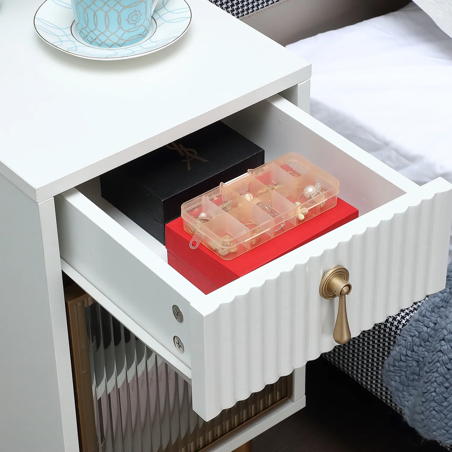 This white and gold nightstand has 1 drawer and large space storage cabinet to hold essentials like magazines,daily necessities and more, tabletop is compact for lamps, books, or watercup,etc. Keep the bedtime items you need within easy reach with this modern bed side table.