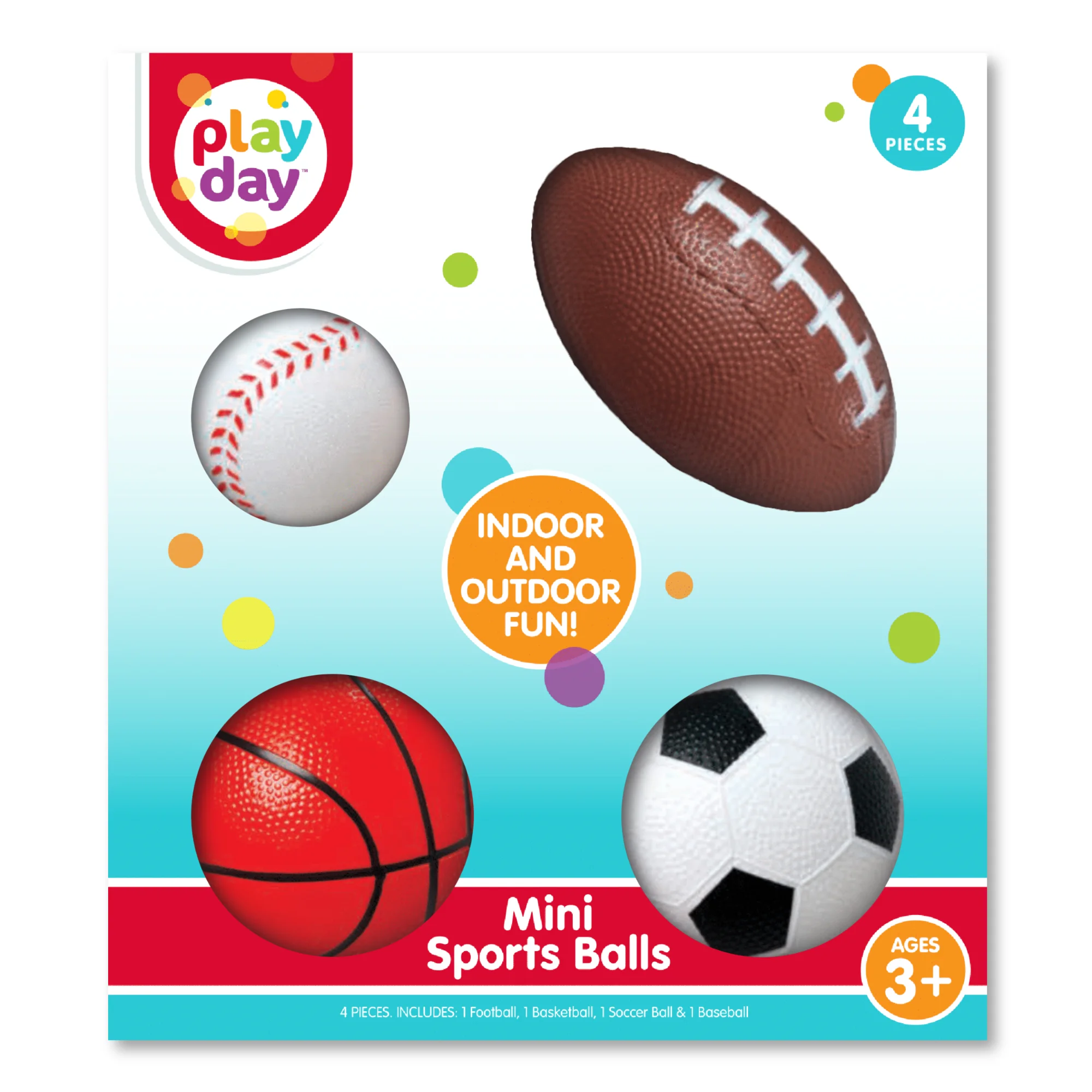 Your child will have a blast sharpening their sports skills with the Play Day Mini Sports Balls 4-Pack! This set includes a miniature football, baseball, basketball, and soccer ball. These balls are a great introduction to the world of sports and their bright, bouncy, rubber designs will provide hours of fun! Your child will be able to learn about different sports, while also improving their hand-eye coordination and motor skills! Whether shooting hoops, playing catch, or kicking into a net, this Mini Sports Balls set is sure to be fun for the whole family!